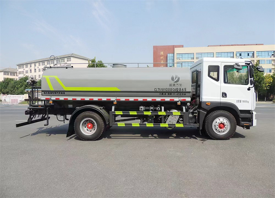 15方灑水車產品主要技術參數 序號 名稱 型號、規格 1 整車型號 CLT5183GPSEQ6A 型綠化噴灑車 2 發動機型號 D4.0NS6B195 3 發動機馬力/功率 康明斯 195 馬力/143KW 4 發動機排量 4000ML 5 變速箱 法士特 8 檔(帶高低檔) 6 輪胎規格 10.00 鋼絲胎 7 軸距 4500 8 總質量 18000KG 9 整備質量 7300KG 10 額定載質量 10505KG 11 整車尺寸(長×寬×高) 8.45*2.5*3.2 12 罐體容積 16 方 13 燃料種類 柴油 14 排放標準 國六 15 水泵型號 60/90 16 罐體材質 Q235 碳鋼