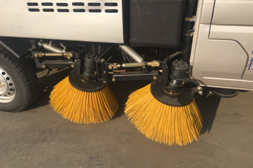 7、左右立掃為雙掃盤,前掃盤帶自動避讓功能,減少了掃刷的數量和掃刷消耗量,能降低使用成本。掃刷上加裝噴水裝置,用于噴霧降塵