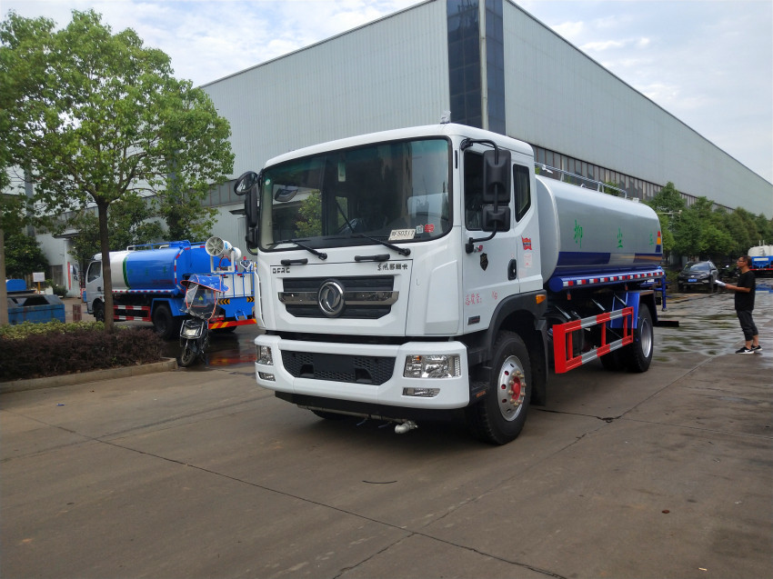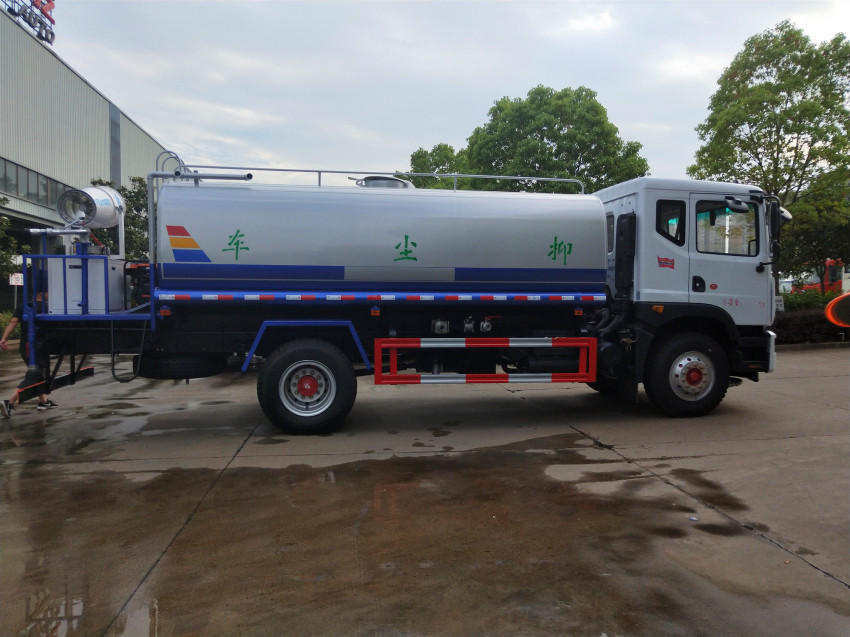 灑水車上裝配置:整車具有前沖、后灑、側噴(更換噴頭后變為側花灑)、后置式工作平臺(帶踏梯,四周有安全護欄)、平臺上設置有高壓水炮(可360°全方位旋轉,水流可調成柱狀,射程28米;也可調成霧狀,射程14米,可連續噴射出:直沖狀、大雨、中雨、小雨、毛毛雨)。該車灑水寬度大于14米,配備優質大功率專用灑水泵、取力器、雜物過濾網、國標通用65型消防接口(可通過消防栓加水)、1套自流球閥系統(可自吸自排,吸程6米)、2根引水鋼絲膠管(帶陰陽快速接頭)、配鎖、水位計、高音作業喇叭,兩側及后加強型保險杠,防滑爬梯,膠管儲存筒。