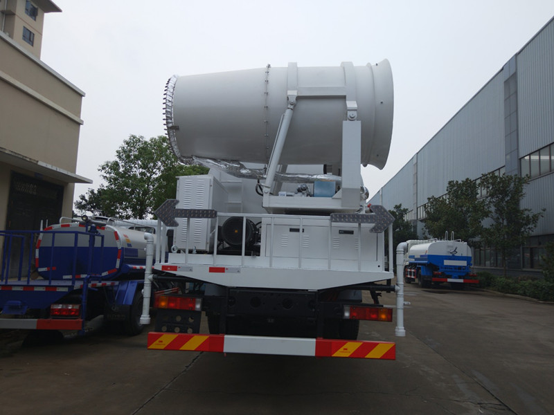 抑塵車吸程≧7米,灑水寬度≧14-16米,射程≧25-40米,引水時間<5min,流量60m3/h。前沖(噴)、后灑、帶側噴(花灑)、帶后工作平臺、平臺上安裝綠化灑水高炮(炮噴射形狀可調節:直沖、大雨、中雨、毛毛雨、霧狀、可連續調節,360°旋轉),配消防接口,自流閥,濾網,帶自吸自排功能。配備大功率專用灑水泵,泵可自吸自排,安裝過濾網,帶消防接口,可通過消防栓進水,帶自流閥,此車尾部加裝大功率農藥噴灑炮,噴灑狀態霧狀,有效射程15-45米,外部平臺帶獨立的機組。