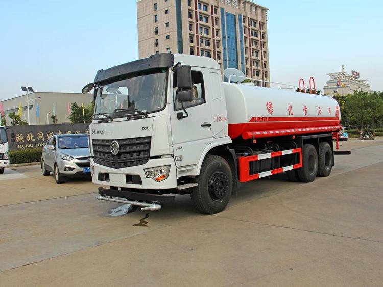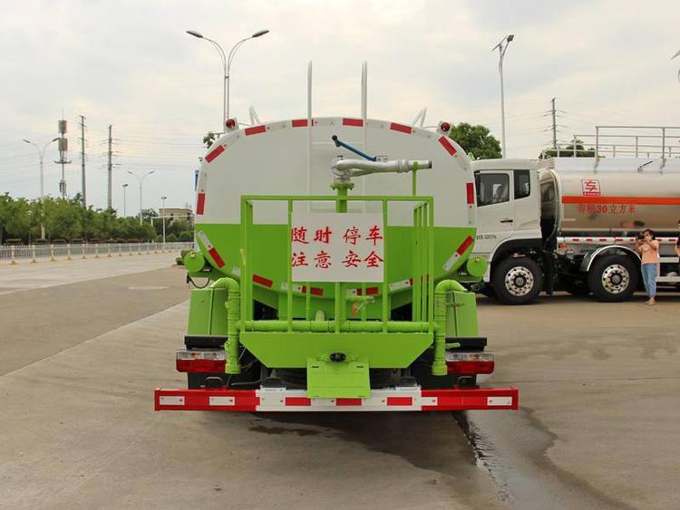 具有前沖、后灑、側(cè)噴(更換噴頭后變?yōu)閭?cè)花灑)、后置式工作平臺(帶踏梯,四周有安全護(hù)欄)、平臺上設(shè)置有高壓水炮(可360°旋轉(zhuǎn),可調(diào)成柱狀,射程28米;也可調(diào)成霧狀,射程14米,可連續(xù)調(diào)成:直沖狀、大雨 、中雨、小雨、毛毛雨),整車灑水寬度大于14米。配備大功率灑水泵,取力器,雜物過濾網(wǎng),通用65型消防接口(可通過消防栓加水)、1套自流球閥系統(tǒng)(可自吸自排,垂直吸程6.5米),2根引水鋼絲膠管(帶陰陽快速接頭),配鎖,水位計,作業(yè)高音喇叭。兩側(cè)及后加強型保險杠,防滑爬梯,膠管儲存筒。