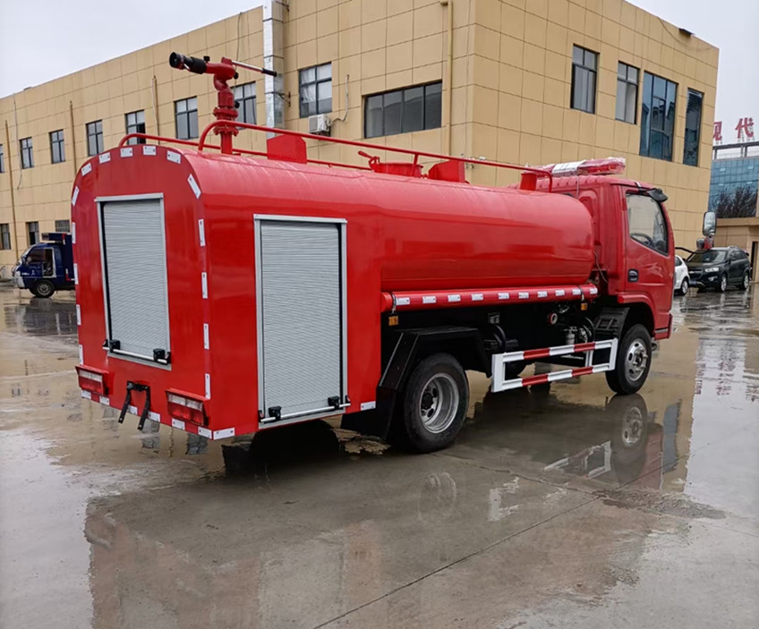 5方消防灑水車 配備大功率專用灑水泵,泵可自吸自排,安裝過濾網,帶消防接口,可通過消防栓進水,帶自流閥,隨車選裝20米綠化卷盤,可噴灑農藥,罐體金屬漆。罐體有橢圓和方圓罐兩種,可根據用戶的要求定做