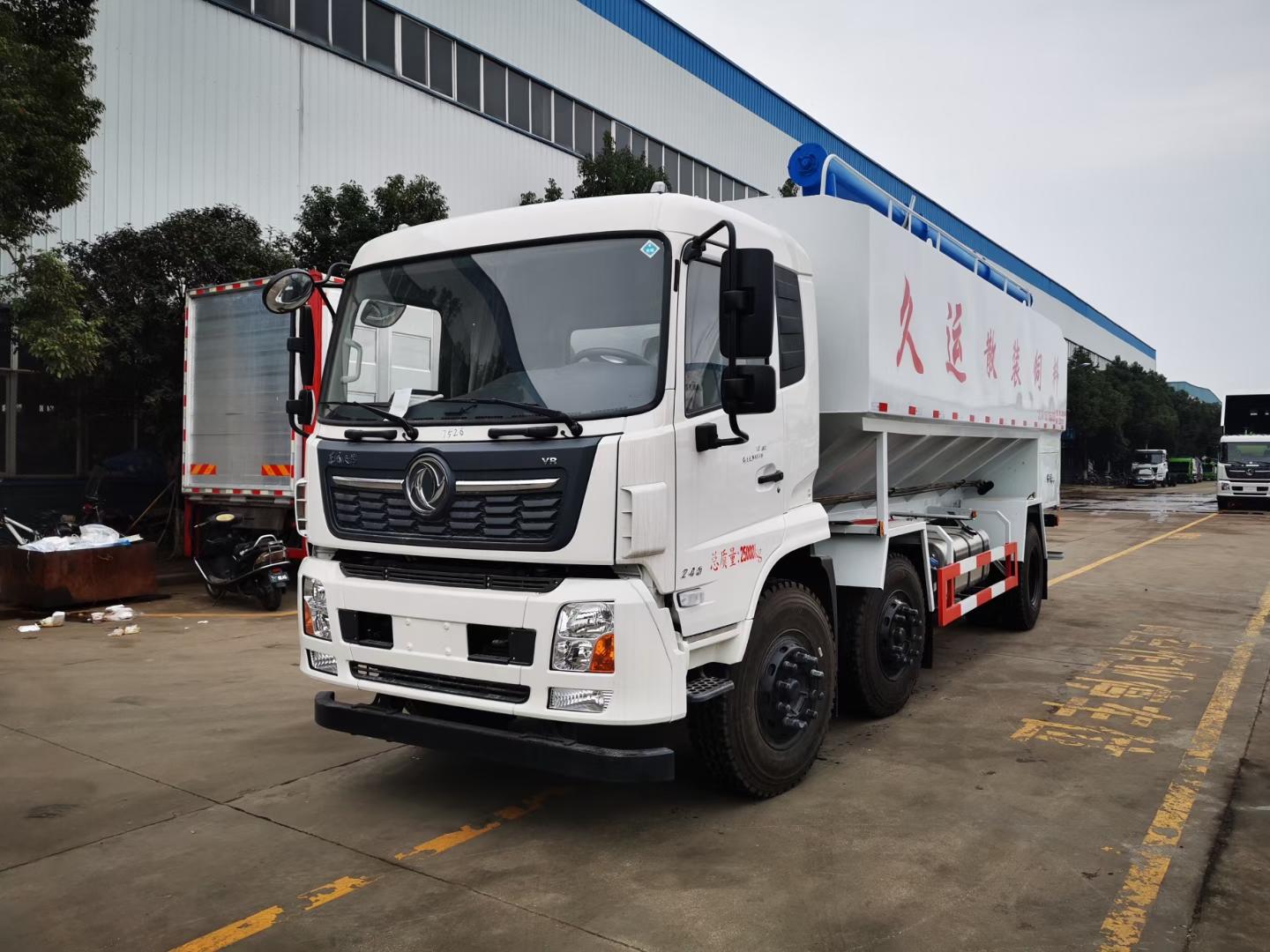 國六東風天錦小三軸散裝飼料運輸車-30方散裝飼料車:東風天錦VR駕駛室,康明斯245馬力發動機,法士特8檔變速箱,1800+5000mm/1800+4100mm軸距,11.00R20鋼絲胎,電動門窗,中控鎖,原廠空調,ABS,方向助力,鋁合金擋泥板,帶環保和燃油,上戶辦營運證無憂!上裝采用武鋼優質碳鋼板,三條絞龍,頂部絞龍可180度旋轉,分設四個倉,可獨立控制各個倉的卸料順序和速度!