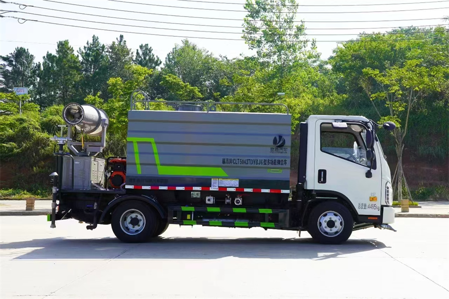 福田7方藍牌霧炮灑水車產品簡述:縱昂牌 CLT5043TDYBJ6 型多功能抑塵車標配前噴(鴨嘴)、后對 沖、后灑、側噴、后置式工作平臺,平臺上配置綠化水炮(可 360°旋轉,既可 以調成柱狀,也可以調成霧狀),配備優質大功率專用灑水泵(可自吸自排, 可從河里或池塘抽水到罐體),取力器,雜物過濾網,消防接口,自流球閥系統、 取力器、球閥、濾網均為國家標準產品,主管道加粗,法蘭墊、法蘭盤加厚, 大通徑球閥。整體具備性能優良安全可靠、效率高、流量大、維修方便等特點。