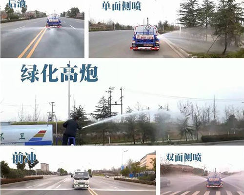 標(biāo)準(zhǔn)配置灑水車主要裝備有:前沖(沖洗公路路面)、后灑(公路路面養(yǎng)護)、側(cè)噴、高位側(cè)花灑(路邊綠化帶優(yōu)化);后工作平臺高壓水炮,可調(diào)節(jié)成柱狀,射程≥28m;也可調(diào)節(jié)成霧狀,射程≥30米,水泵自吸高度:≤7m,灑水寬度:≥15m。側(cè)防護網(wǎng),自流閥,消防接頭。灑水車水泵為常壓水泵,功能可以抽水、排水。另外根據(jù)用戶要求,可加消防泵、噴霧機、農(nóng)藥卷盤、農(nóng)藥柱塞泵。罐內(nèi)可以做防腐防銹、電磁閥氣動閥自動放水等****,以滿足不同用戶需求。