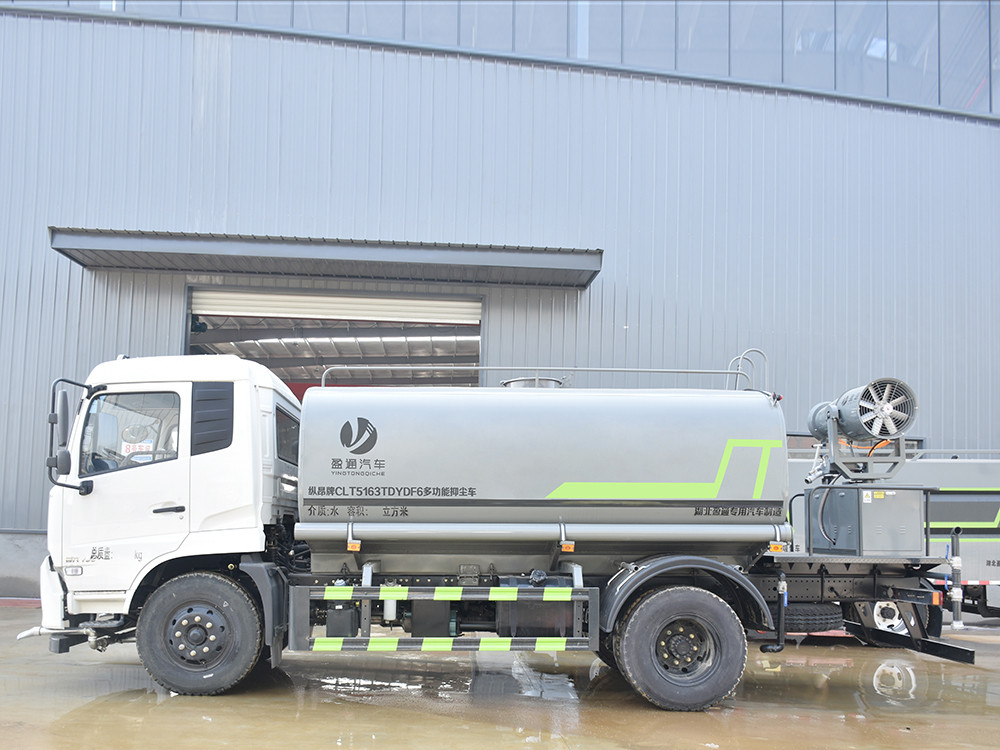 東風天錦 12 方抑塵車-灑水車產品主要技術參數 序號 名稱 型號、規格 1 整車型號 CLT5180TDYDF6 型多功能抑塵車 2 發動機型號 B6.2NS6B210 3 發動機馬力/功率 康明斯 210 馬力/154KW 4 發動機排量 6200ML 5 變速箱 東風 6 檔 6 輪胎規格 10.00 鋼絲胎 7 軸距 4700 8 總質量 18000KG 9 整備質量 8000KG 10 額定載質量 9805KG 11 整車尺寸(長×寬×高) 8.6*2.5*3.2 12 罐體容積 12 方 13 燃料種類 柴油 14 排放標準 國六 15 水泵型號 60/90 16 罐體材質 Q235 碳鋼