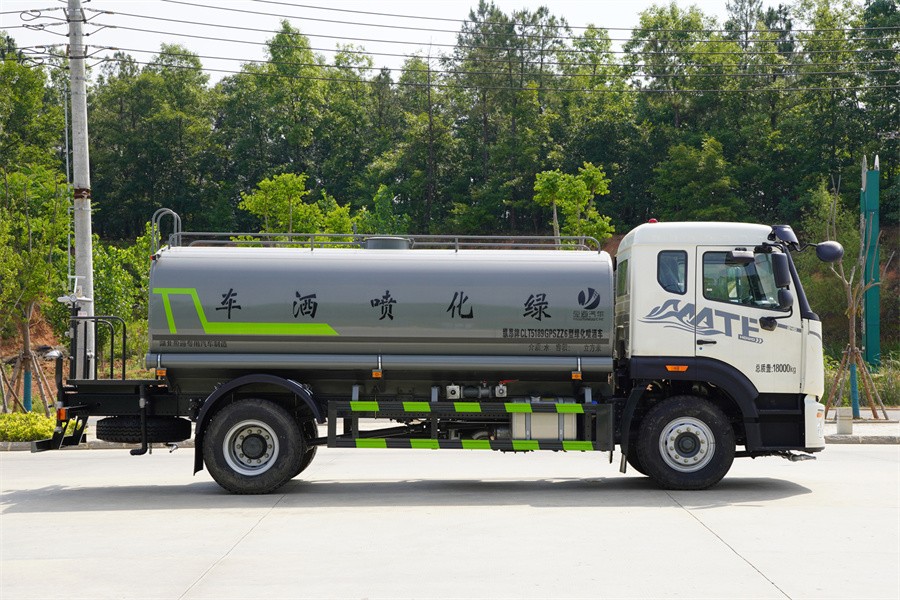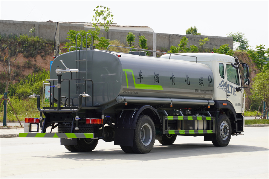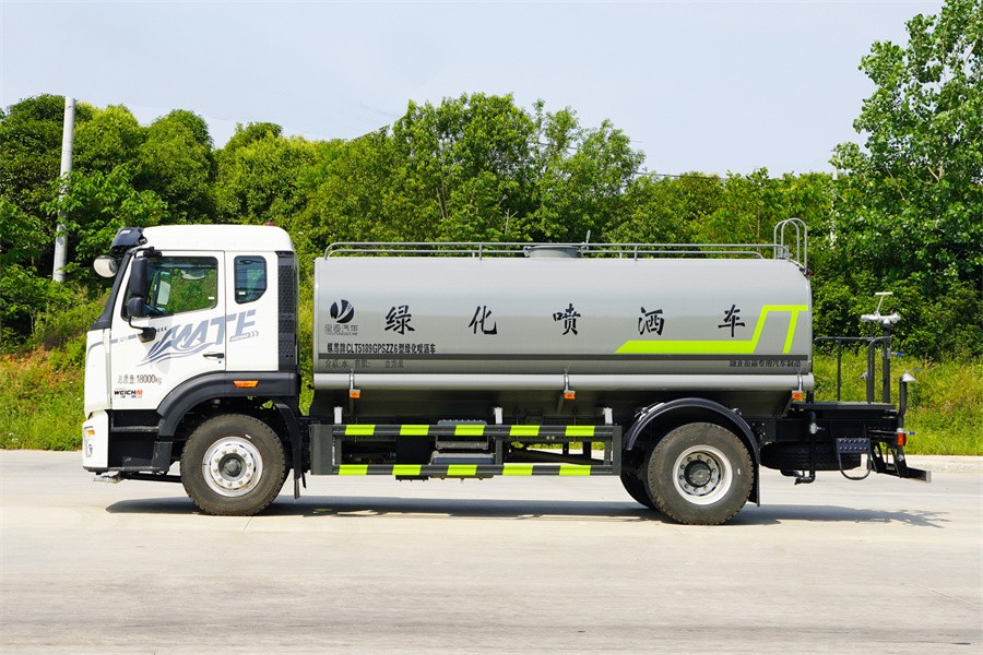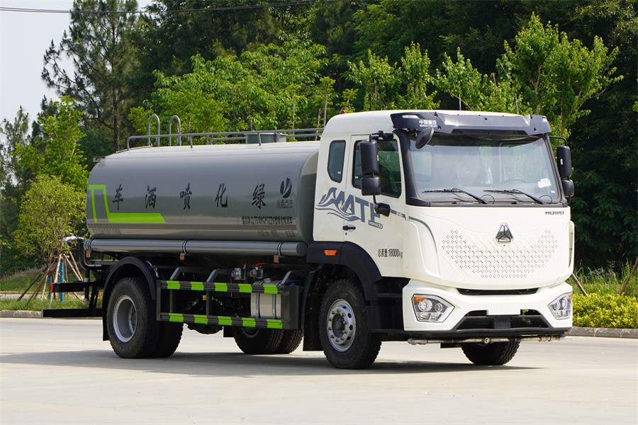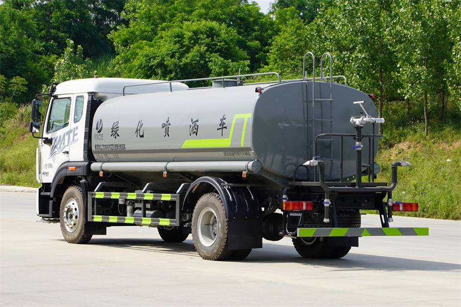 重汽15噸灑水車產品標配前噴(鴨嘴)、后沖、后灑、側噴、后置式工作 平臺,平臺上配置綠化水炮(可 360°旋轉,既可以調成柱狀,也可 以調成霧狀,更可以調成直沖狀、大雨、中雨、小雨、毛毛雨),配 備優質大功率專用灑水泵(可自吸自排,可從河里或池塘抽水到罐體), 取力器,雜物過濾網,消防接口,自流球閥系統、取力器、球閥、濾網 均為國家標準產品,主管道加粗,法蘭墊、法蘭盤加厚,大通徑球閥。 整體具備性能優良安全可靠、效率高、流量大、維修方便等特點